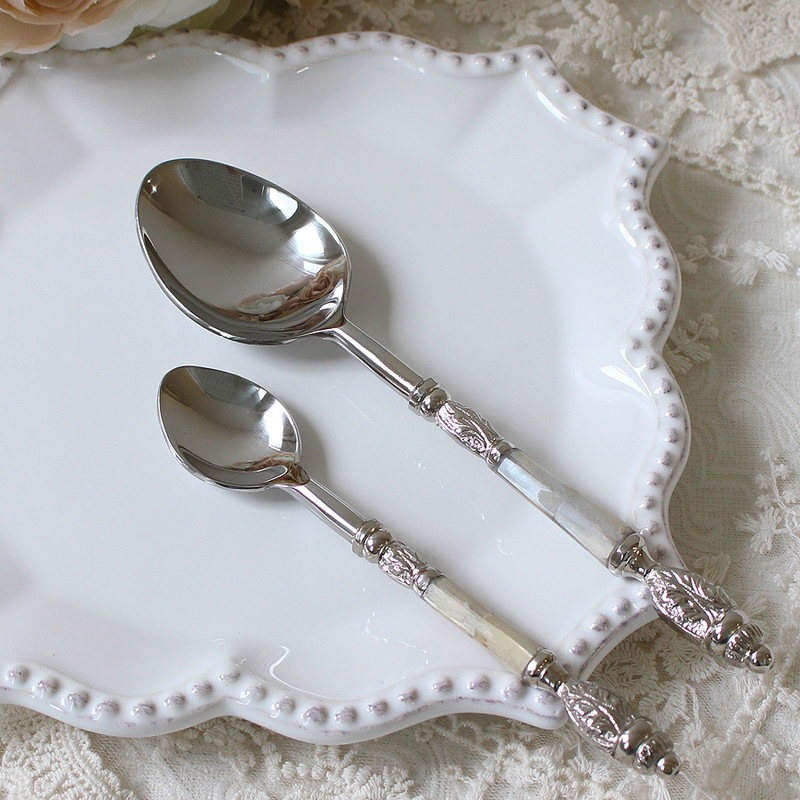 Item Storyストーリー 持ち手がシェル(貝)で作られているお洒落なステンレス製のティースプーンです。シェルの柄・色の出方は全く同じではありませんので風合いをお楽しみいただけます。ポイントで彫刻も施されていて見た目はとても上品なデザインです。シリーズで揃えればおもてなしにも対応できます。お好みのテーブルコーディネートをお楽しみください。※下記のような貝の欠けが1本に複数ある場合もございます。天然素材の為、不良ではございません。予めご了承ください。※色味の違いがある場合がございますので予めご了承ください。