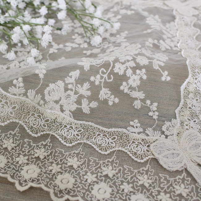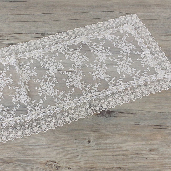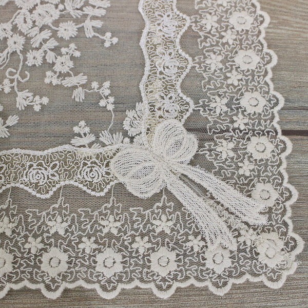 繊細で豪華なデザインのレーステーブルセンター。 優しい刺繍のチュールレースに可愛いリボンのレースモチーフがポイントです。